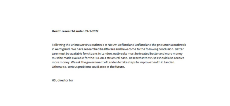Since December 30-12-2021 20 people in Liefland and Nieuw-Liefland have been infected with a unknown virus. 5 people are believed to have died from the virus. We are still investigating the matter.